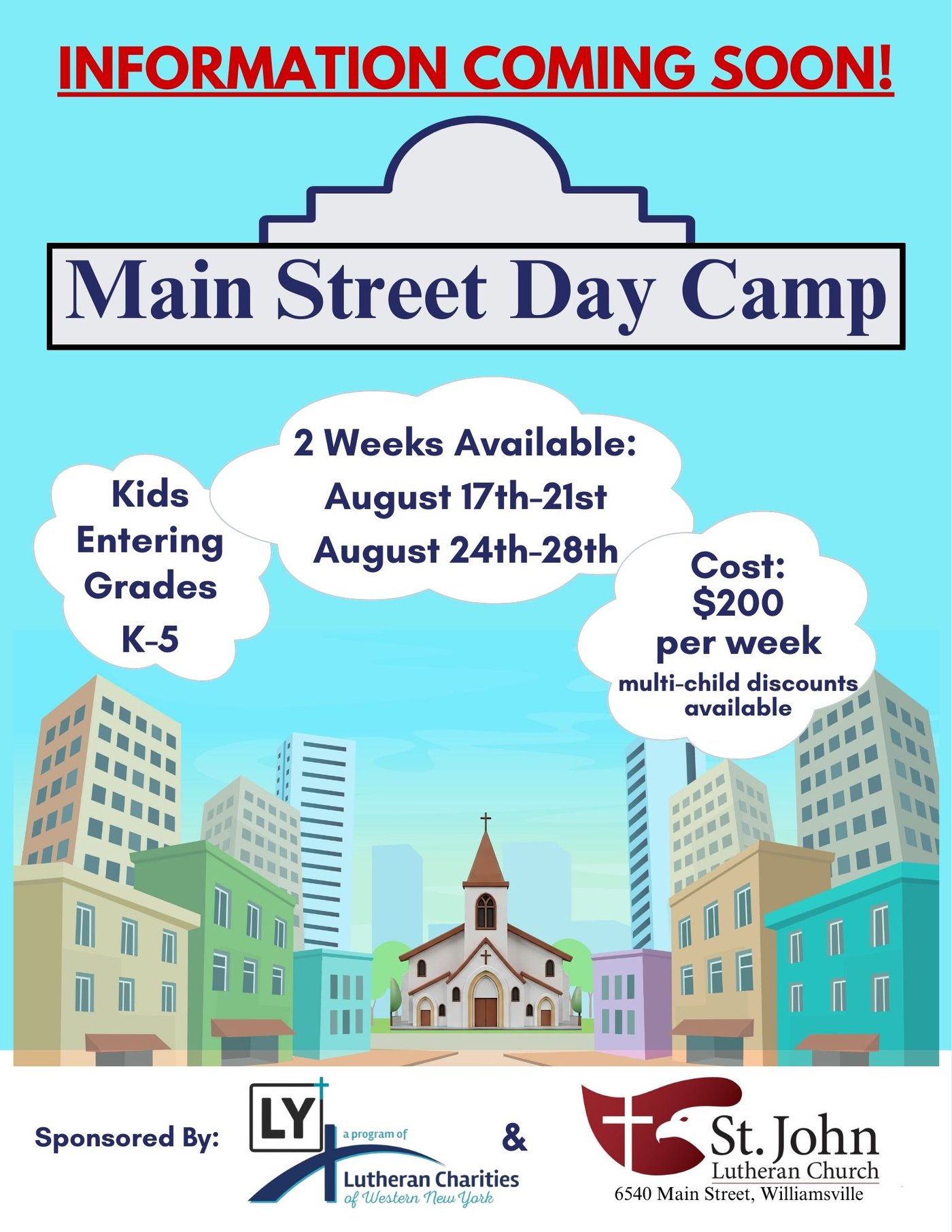 St. John Lutheran Church is handling the registration and payment. To pay you may click here (select MAIN STREET DAY CAMP be sure to name your child/children when asked to "designate") or make checks payable to St. John Lutheran Church and send them to 6540 Main St., Williamsville, NY 14221. Registration is complete when the online form has been filled out and the payment is received.